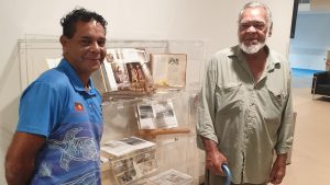 The first set of Mosaics revolve around the local First Nations People, the Taribelang Bunda people. Some of these artworks have been re-created, with their permission, in the Yarning Circle. Others have been created in conjunction with the emerging elder, Byron Broom. (Pictured with his dad, Uncle Willy)